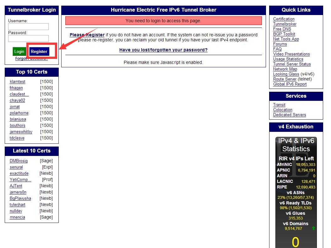 | (敲黑板,知识点来了)首先打开HE官方网站https://tunnelbroker.net/,点击左上角的register注册一个帐号记住你的帐号和密码,然后登录帐号(如下图) |