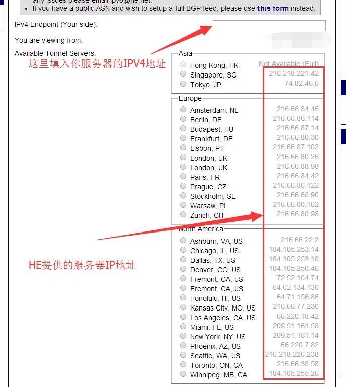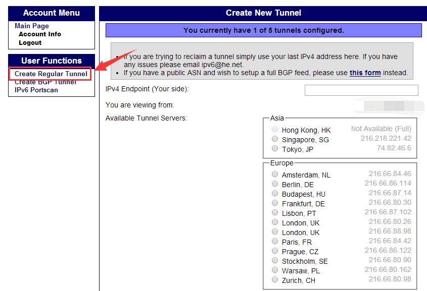 每个帐户可以申请5个IPv6 Tunnel,如果ISP支持BGP协议还可以申请BGP Tunnel,不过大部分人都不支持,所以还是老老实实地申请一般的Regular Tunnel吧。在左边点击User Functions下的Create Regular Tunnel (https://tunnelbroker.net/new_tunnel.php),输入你服务器的IPV4地址,建议大家在选择HE服务器之前先用自己的服务器ping一下HE提供的服务器地址,选择延迟最低的(香港的就不要考虑了一般都是满的状态,即使有货延迟也是高的一B,全程绕lax,一般延迟低的是Fremont, CA, US毕竟有海底光缆,这个也要视情况而定还是自己测试一下)(如下图) |