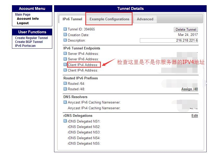 创建成功之后点击左上角的Account Menu下的Main Page (https://tunnelbroker.net/)确认一下Client IPv4 Address是不是你服务器的IPV4地址不是的话删除了然后再重新创建一个,点击上边tab的Example Configurations (https://tunnelbroker.net/tunnel_detail.php?tid=394665#tabs-2)在select your os的下拉菜单中选择你用的操作系统(如下图)
