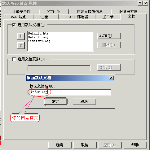 ⑶设置“文档”:单击“添加”按钮,弹出“添加默认文档”对话框,输入你的网站首页文件名,本文为index.asp。